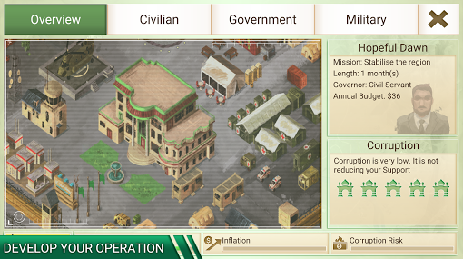 游戏中玩家们将会来到自己选择的区域当中,成为这里临时的治理者,通过建设民生、发展政府项目来发展该区域,获得人民们的支持,提高自己的声望;同时还要去训练军队,建设防御设施,消灭一切妄想占领该区域的反叛军,保持地区的稳定性。游戏的可玩性和策略性十足,体验起来非常的精彩!