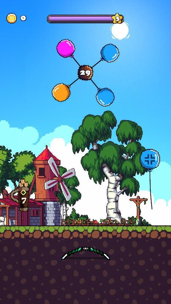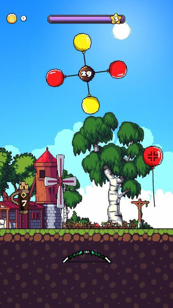 游戏里的玩法比较简单,就是发射弓箭射击气球,当关卡里的气球全部被击破就可以通关。需要注意的是每次需要击破的气球是有顺序的,玩家需要根据关卡给出的气球颜色来发射弓箭击破气球,如果击中错误的气球就会减少闯关时间,如果不能再规定时间内完成就会闯关失败。
